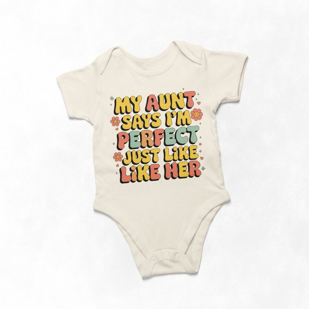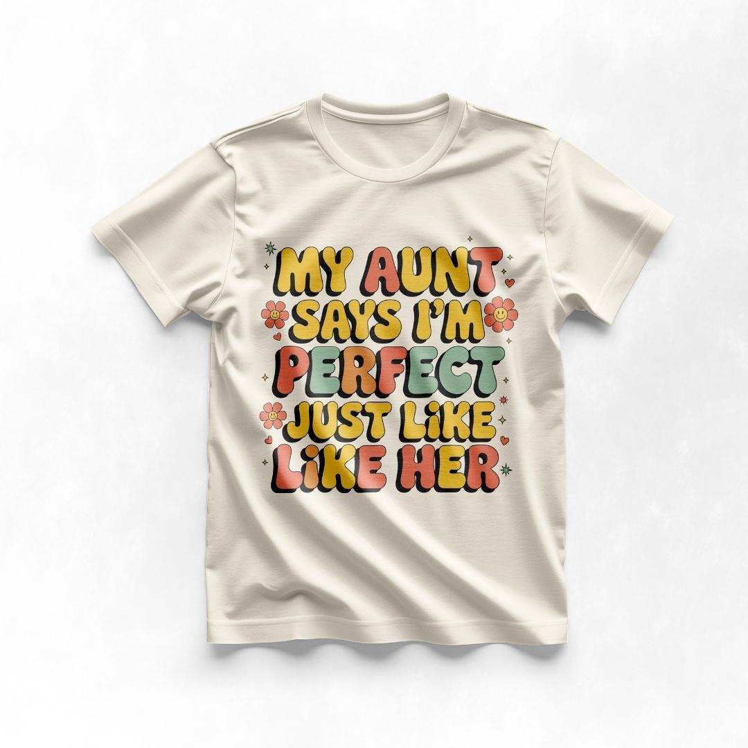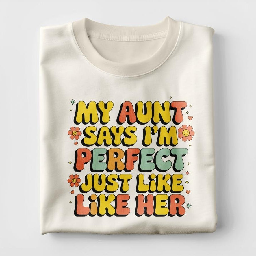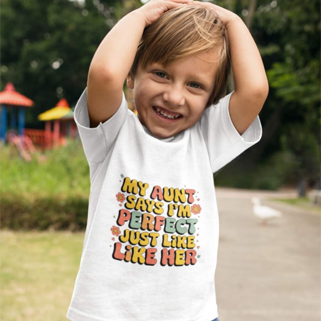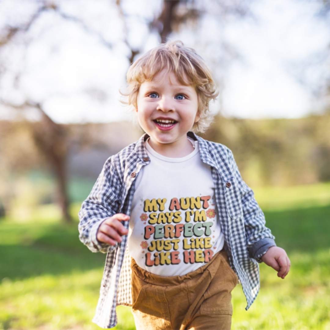 Celebrate the special bond between your little one and their aunt with our “My Aunt Says I'm Perfect Just Like Her” Tee! Perfect for family outings, playdates, or photos, this adorable design spreads smiles and love wherever it goes. Made from soft, high-quality cotton, it keeps your child comfy all day long. A thoughtful gift for birthdays, holidays, or just because — available in baby bodysuit and toddler tee sizes for the perfect fit.