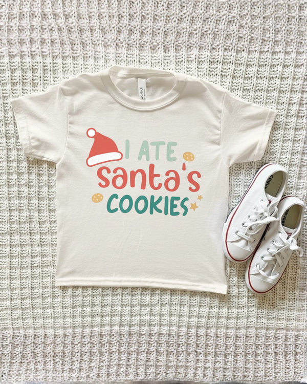 Confess your holiday cookie capers with our adorable "I Ate Santa's Cookies" kids' tee! This playful design features a festive Santa hat and cheerful, colorful lettering, complete with cookie and star accents.